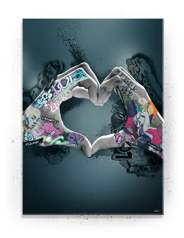 Hands making Heart (Plakat/Lærredsprint). Kan bestilles som stort billede eller plakat. Grafitti Kunstværk / Artwork (Lærredsprint/canvas) fra serien Statements, med de farverige grafitti elementer.