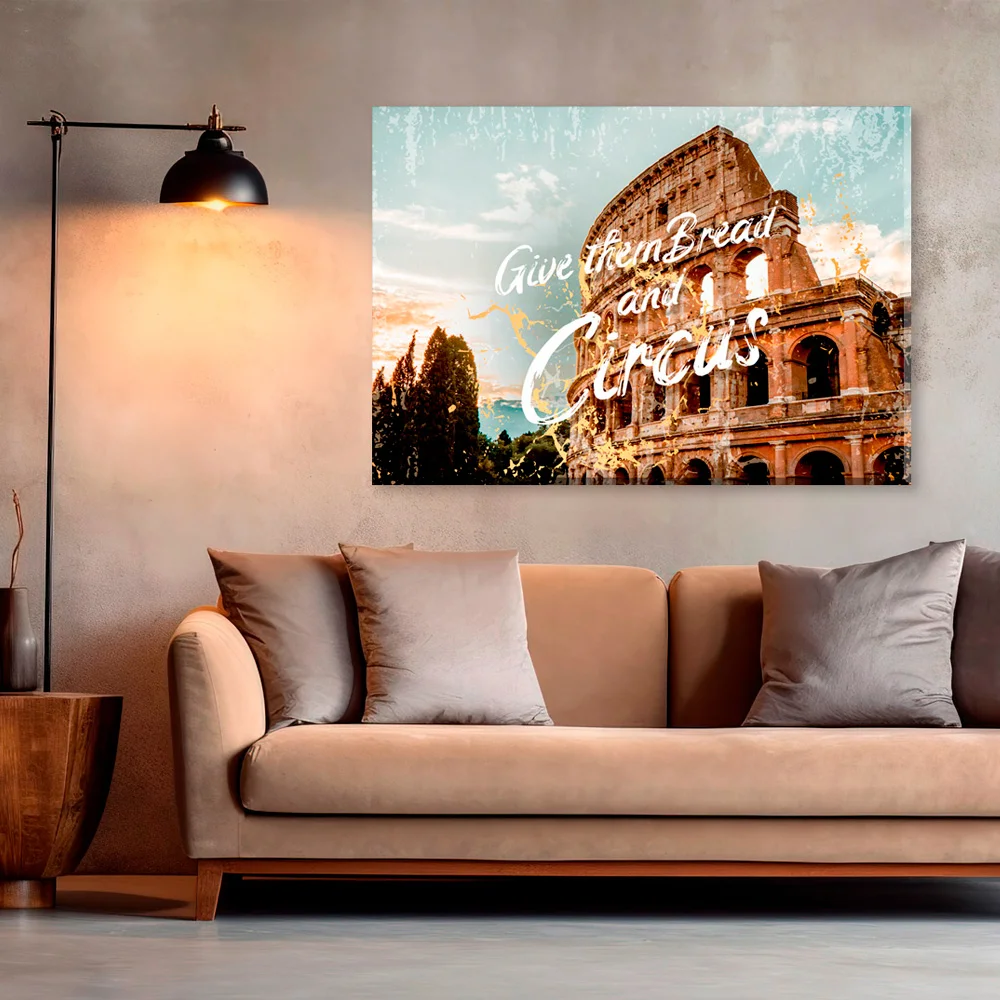 Bread and Circus (Plakat/(Lærredsprint). Det giver stof til eftertanke, når vi søndag efter søndag møder op på stadion og ser fodbold og drikker øl. Billedet indeholder Colosseum og teksten “Bread and Circus”.
