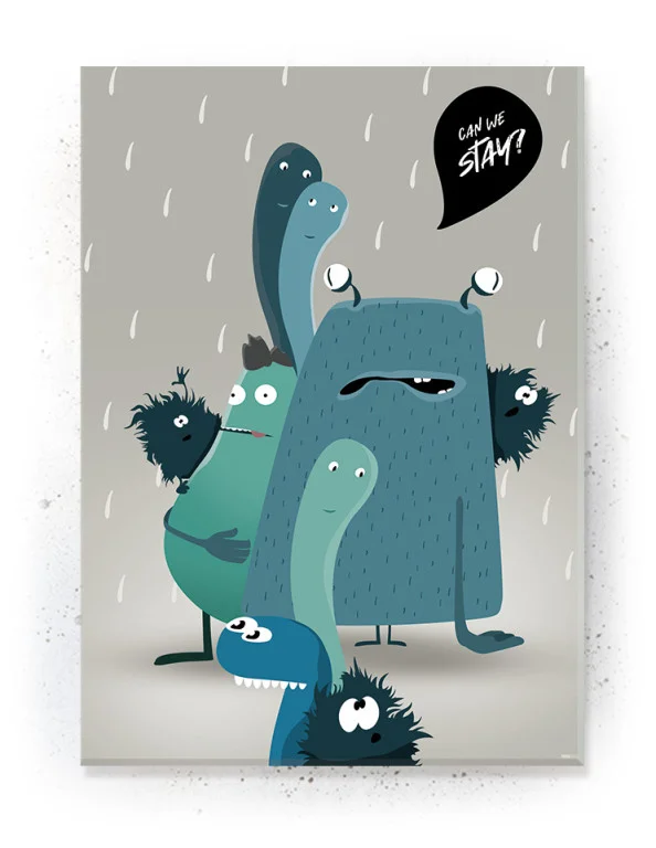 Plakaten med de søde/sjove monstre, der spørger: “Can we stay!” er perfekt til børneværelset – når børnene har nået en alder hvor det er ved at være på tide at se sin frygt for monstre under sengen i øjnene. Som forældre kan du hænge den op som en reminder til dit barn, at det er deres egen fantasi, der skaber monstre, hvorfor de bare skal forestille sig at de er fjollet i stedet for farlige, så skal det nok gå!