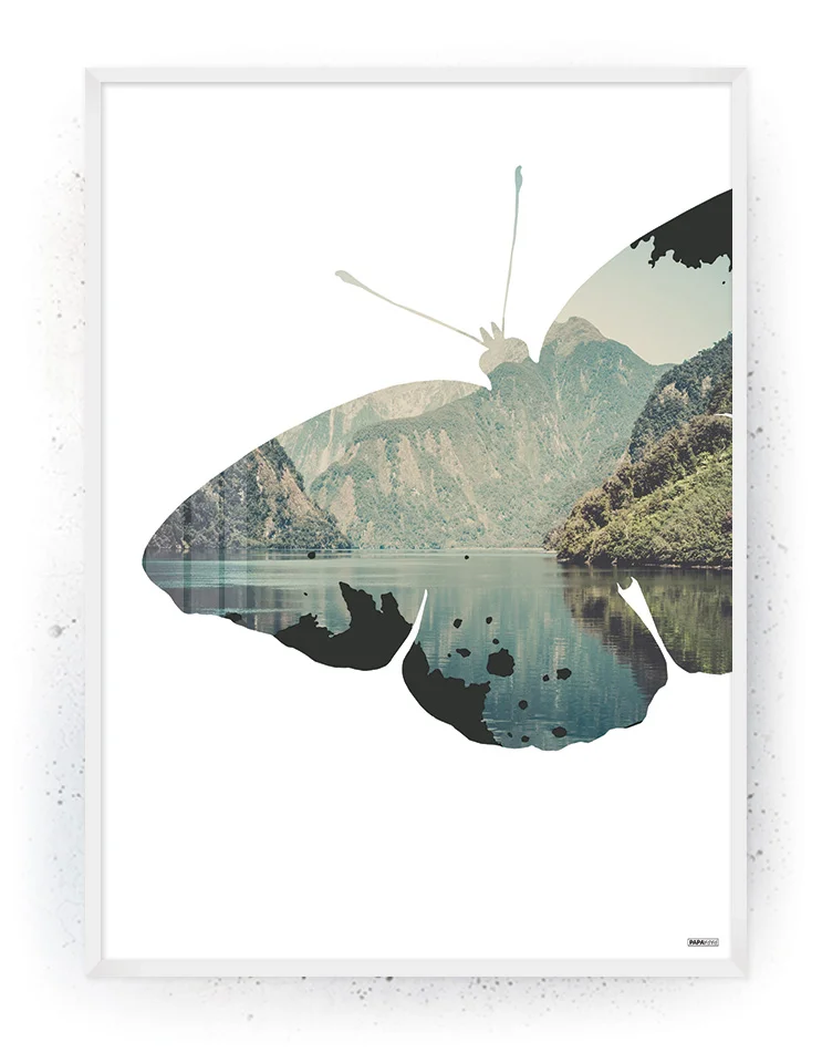 Sommerfugl (Plakat/Lærredsprint). Kan bestilles som stort billede eller plakat. Kunstværk med naturen i centrum. Artwork (Lærredsprint/canvas) fra serien Nature, med de farverige bjerge, himmel, søer, skove og træer.