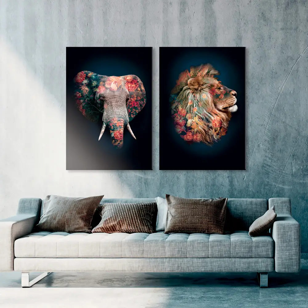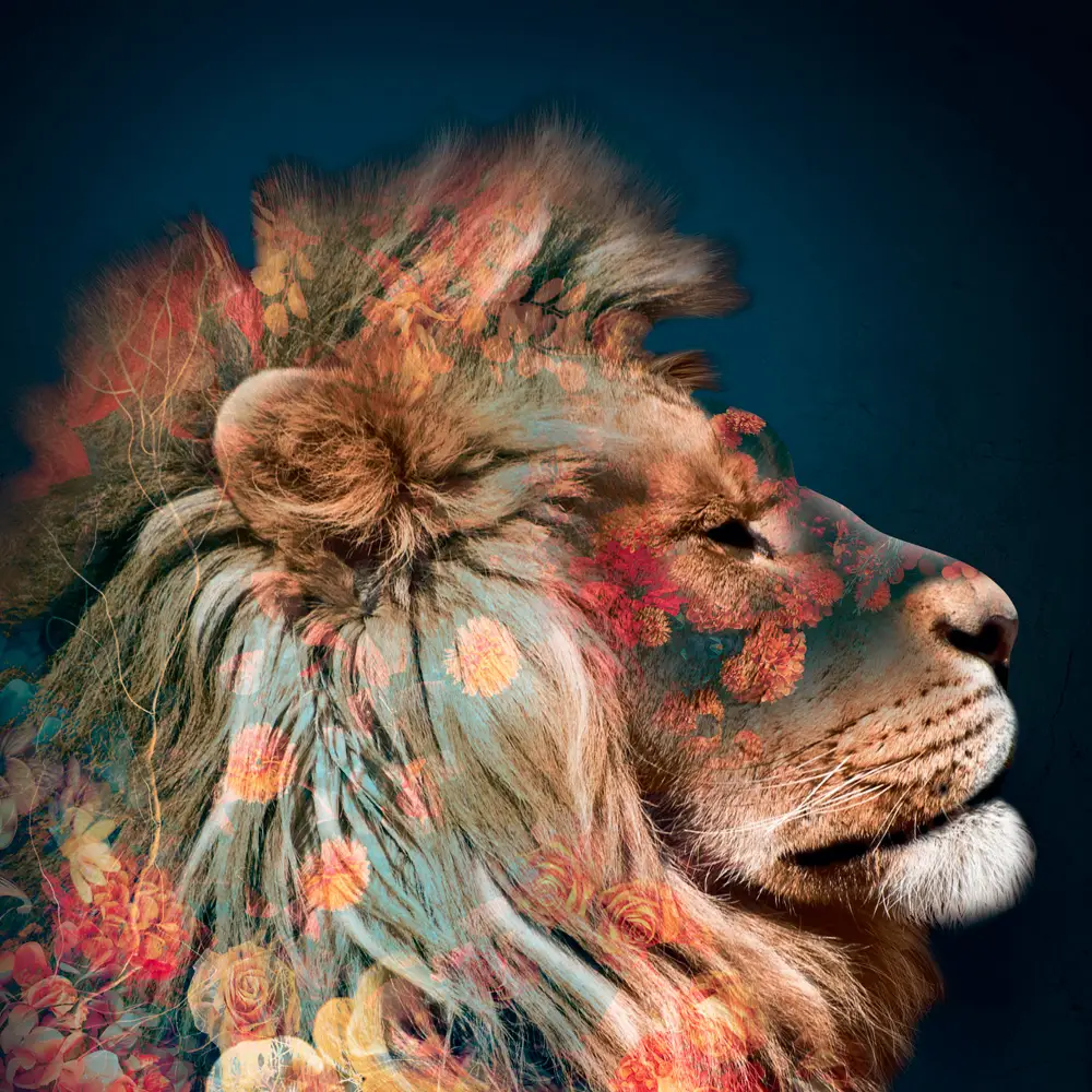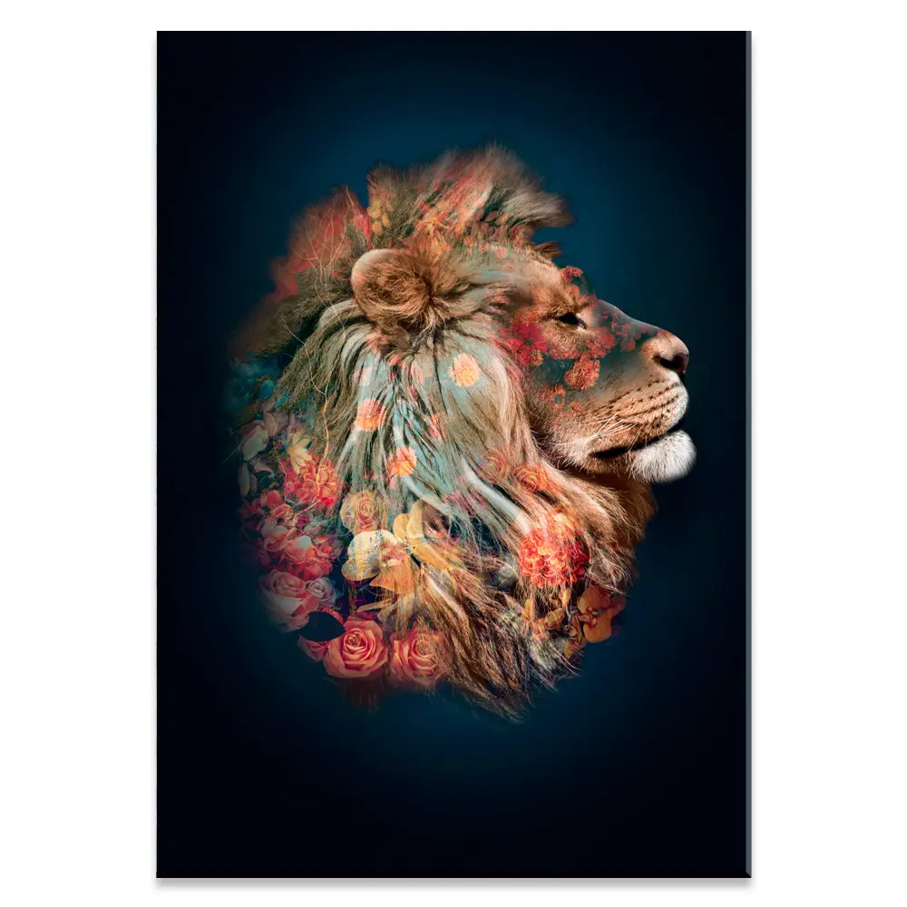 Løve (Plakat/Lærredsprint). Kan bestilles som stort billede eller plakat. Smukt Kunstværk / Artwork (Lærredsprint/canvas) fra mini serien Floral Animals, med de smukke blomsterige dyremotiver.